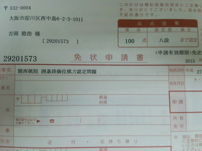 平成27年8月20日付で、関西棋院から囲碁八段の認定を受けました。免状日付は、平成27年7月21日付となります。